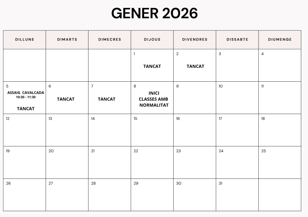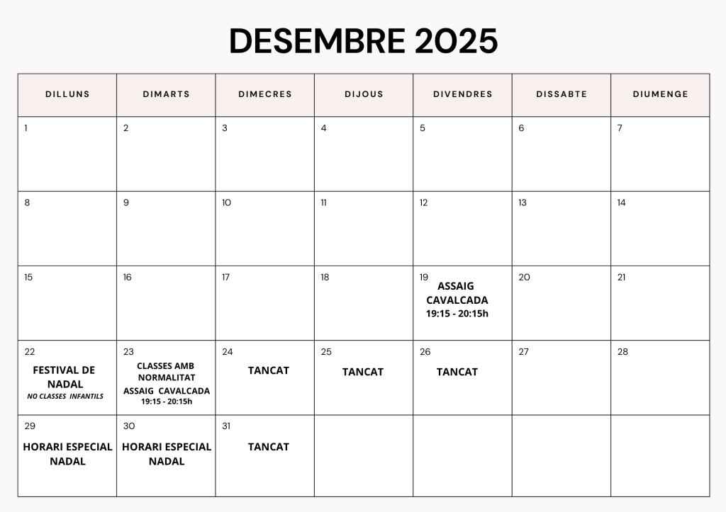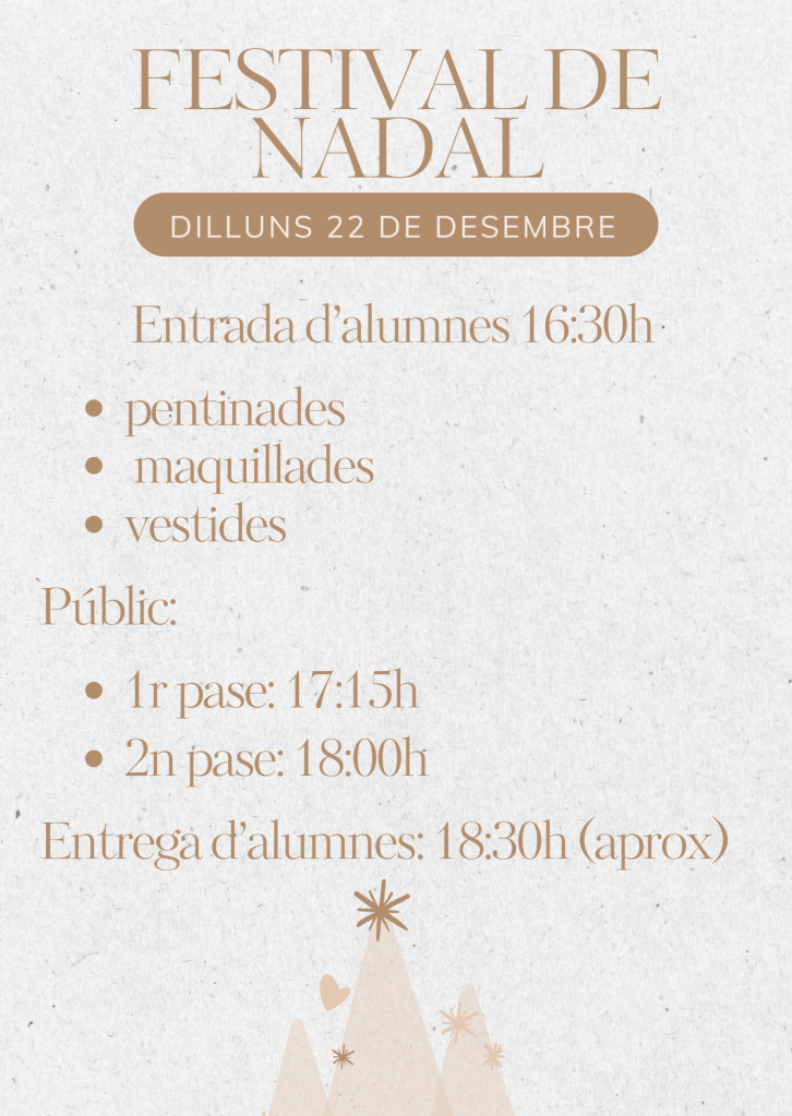 - 22/12/2025 festival de Nadal només per les alumnes que indica al cartell. Les classes infantils d’aquell dia queden suspeses. La classe de tonificació de la nit es manté.